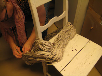 Seuraavaan työvaiheeseen on useampia tapoja. Me teimme näin: Suoraan vyyhdeltä kasteltiin pieni sykerö läpeensä vesiliimaseokseen. Lankaa ei katkaista vai otetaan seuraava sykerö. Paljon ei kannata kerralla kastella, naru menee muutoin solmuille.