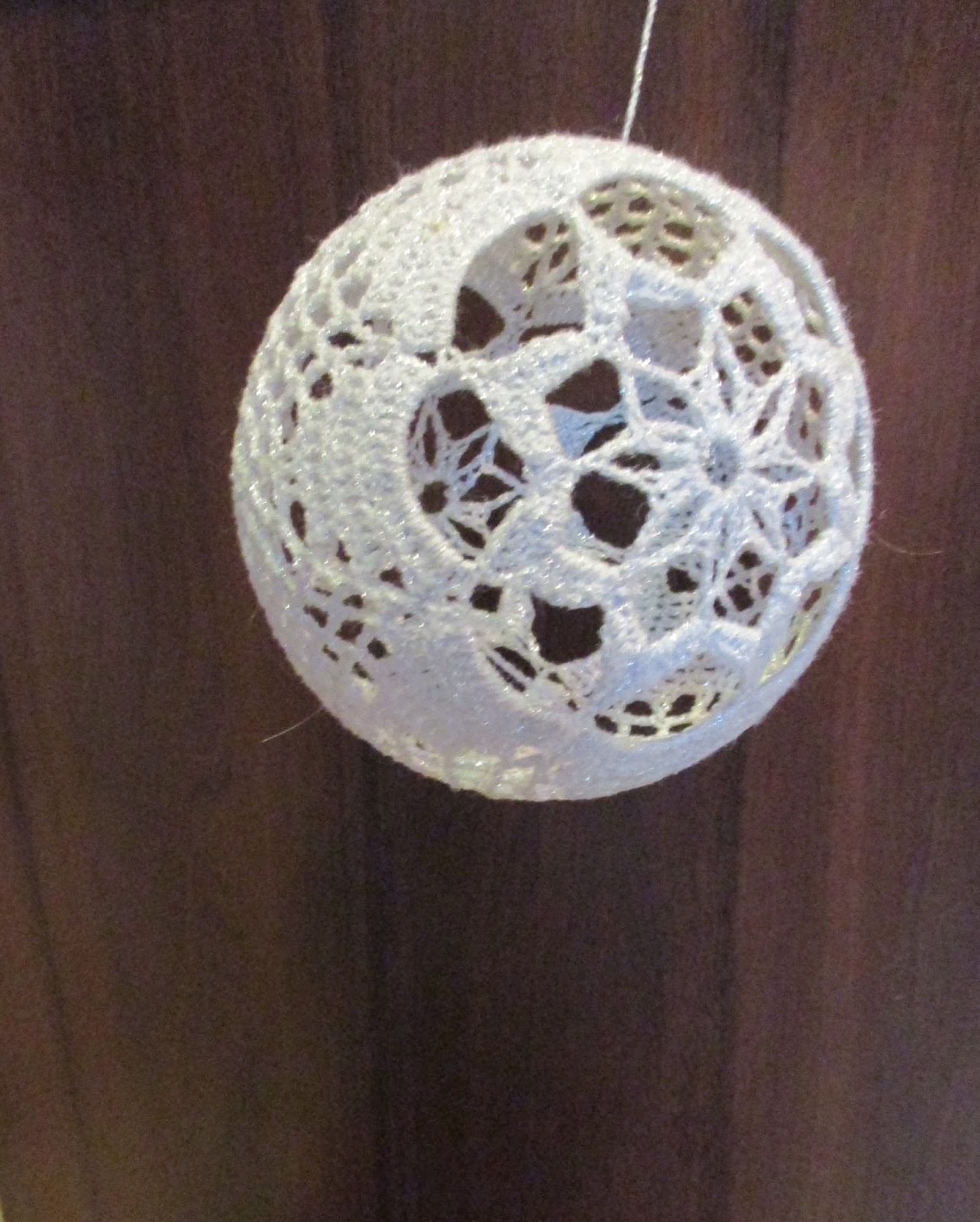 Vaikka ohje on sama, mutta kun on paksumpi lanka, pallosta tulee jokseenkin paljon isompi. Ensimmäisellä kerralla tämän kovetus ei onnistunut. Tein uudemman erän vesiliimaseosta, mutta vähän tujumpana. Nyt pallo on hentoisesti kovettunut. Liimoissakin näyttää olevan eroja, tästä ei ainakaan jäänyt minkäänlaista jälkeä kuivuessaan.