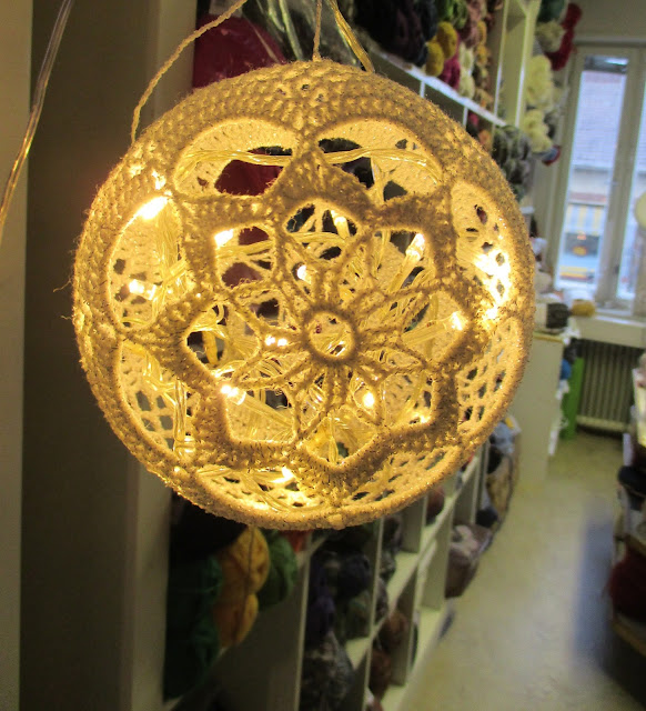 Pellavasydämessä on meneillään joulunäyttely. Tämä valopallo arvotaan lipukkeen täyttäneiden asiakkaiden kesken.
