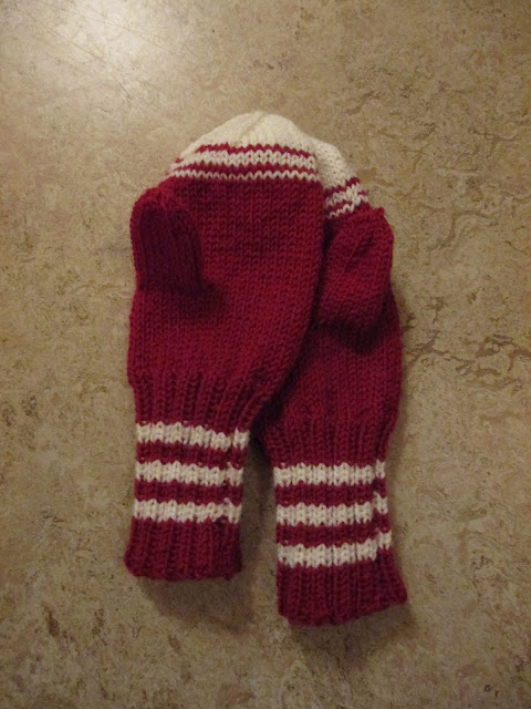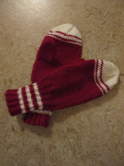 En saanut näin yöllä vangittua oikeaa väriä tähän kuvaan. Nämä ovat kirkkaan punaiset, juuri sellaiset oikean jouluiset! Olipa muuten mahdottoman nopeat neuloa; sain puolitoista sukkaa valmiiksi Tyksin reissulla. Tilasin nimittäin Kela-taksin, joten sain koko ajan neuloa. Nämä punaiset lapaset on tehty Teeteen Salla-langasta, joka on aikas paksua; sellaista seiska veikan paksuista ainakin.