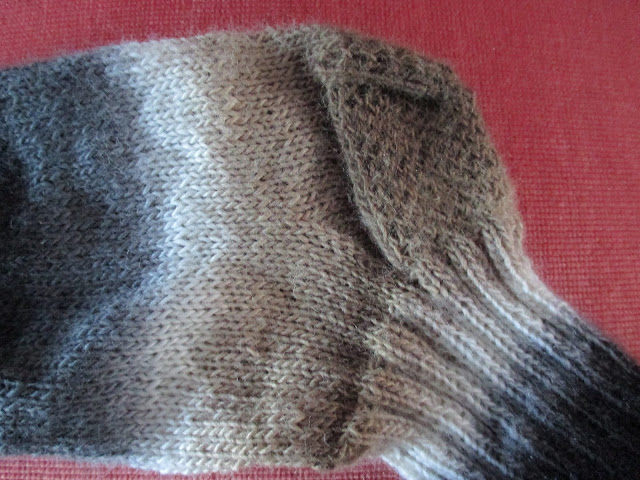 Tämän langan neulominen on kuin rullalankaa työstäisi, niin ohutta se on. Mutta nythän minulla on aikaa. Näistä kirjavista langoista teen aina sileät sukat, kun haluan että värit tulevat näkyviin. Toki tähänkin olisi voinut jonkun palmikon laittaa? Kantapään teen nykyisin lähes aina tuollaisena ristiinvahvistettuna.