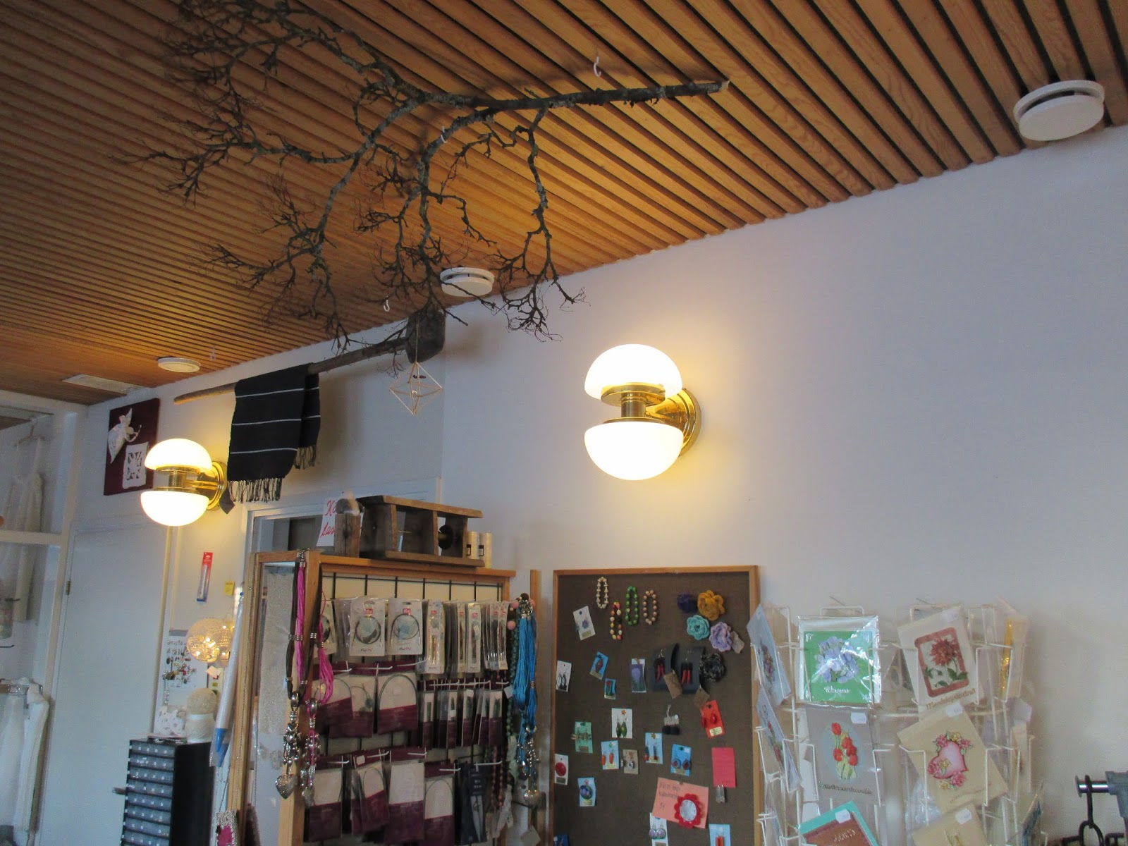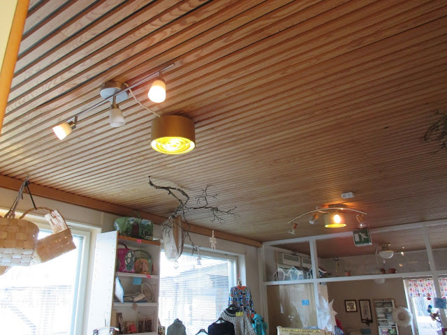 Varsinkin nyt joulun aikaan kärsin liian heikosta valaistuksesta. Yllätys, yllätys, putiikin ikkunaseinä on kaikkein pimein alue. Kun siirsimme villasukat sinne ja kun villasukkia kaikkein eniten lahjoiksi etsittiin, jouduin tämän tästä valittelemaan asiakkaillekkin huonoa näkyvyyttä.