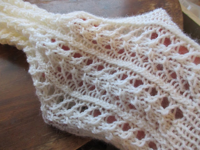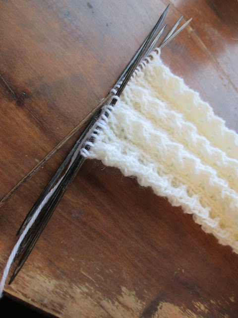 Malli on erittäin helppo, pelkkiä oikeita ja nurjia, langankiertoa ja kavennusta. Kun kuvio on vain 7 silmukan ja neljän kerroksen kokoinen, sen oppii hyvin pian ulkoa. Sitten vaan samaa toistetaan… En tapaa tehdä polvisukkiin kavennuksia ja tämäkin malli näytti kuvassa tasapaksulta.