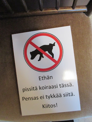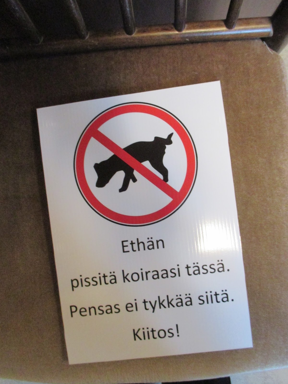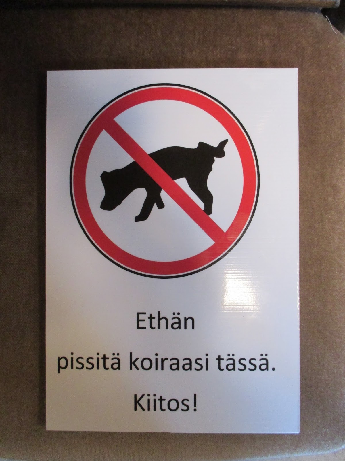 Mieheni laittoi tämän uuden tontin nurkkaan koirille kieltolapun. Oikein hauska tarina on eräästä rouvasta, joka arveli, että kyltti on heidän koiraansa varten laitettu. Hän on kuulemma sille jo monta kertaa sanonut, että ”ei siihen saa…” mutta kun se ei usko. Ilmeisesti tiesi koiransa osaavan lukea?