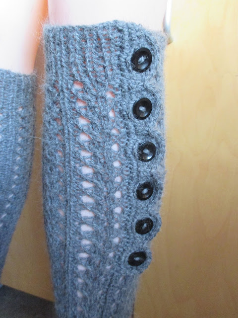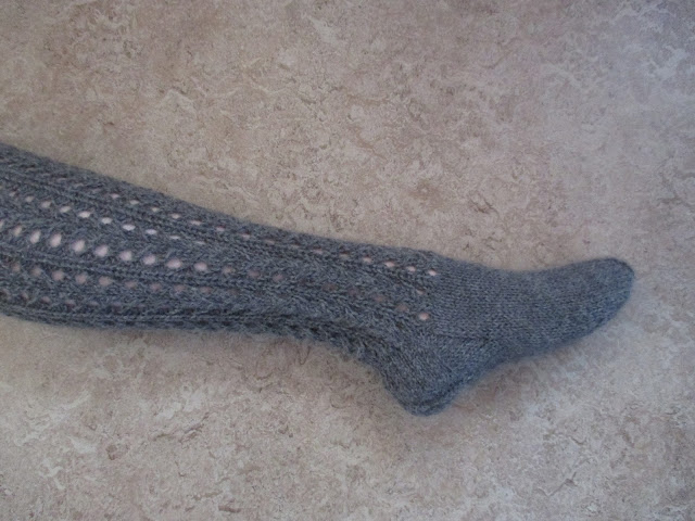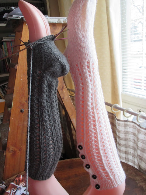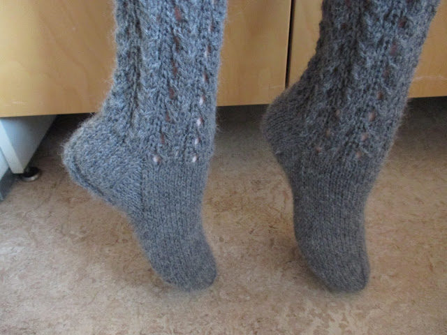 Aiemmin esittelin luonnonvalkoiset pitsipolvarit, joihin sain tilauksen facebookin käsityöryhmästä. Asiakas kyseli tekijää kuvan mukaisille sukille. Lupasin tehdä ja samalla sain toisenkin tilauksen. Kuvan perusteella tein oman ohjeen asiakkaan toivomuksen mukaisesti.