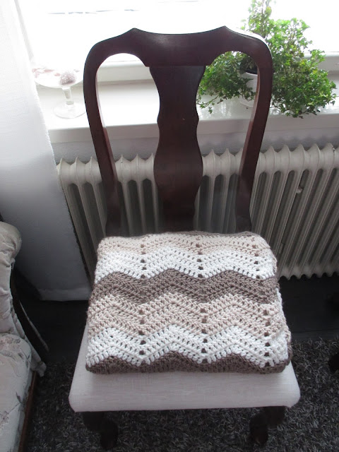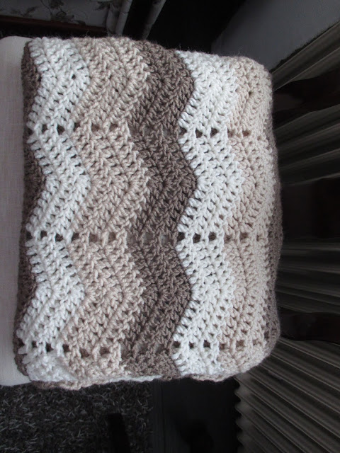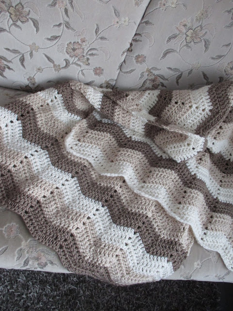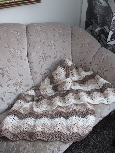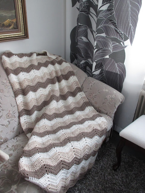 Näytinkin tämän peiton jo vähän keskeneräisenä. Mutten malta olla vieläkin kuvaamatta sitä. Novitan Naava-langasta koukulla numero 5,0 mm virkattu sik-sak-peitto. Lankaa kului 9 kerää, eli 3 kerää kutakin kolmea väriä. Yhteensä peitolla on painoa hiukan vaille 900 g. Näillä langoilla peiton kooksi tuli 80 x reilu 140 cm.