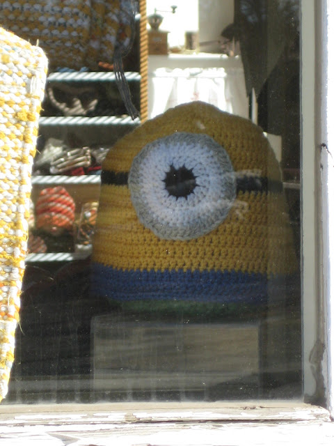 Valmista mattoa ja matonkudetta rullalla ja vyyhdellä, askartelutarviketta ja ideoita, nuken vaatteita, kori… niistä muodostui meidän ikkuna. Ikkunan alareunassa tilannetta tarkkailee yksisilmäinen Minion-hahmo – Stuart.