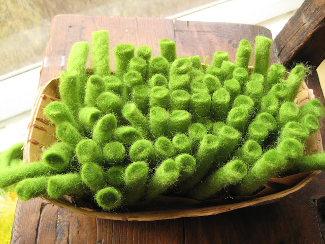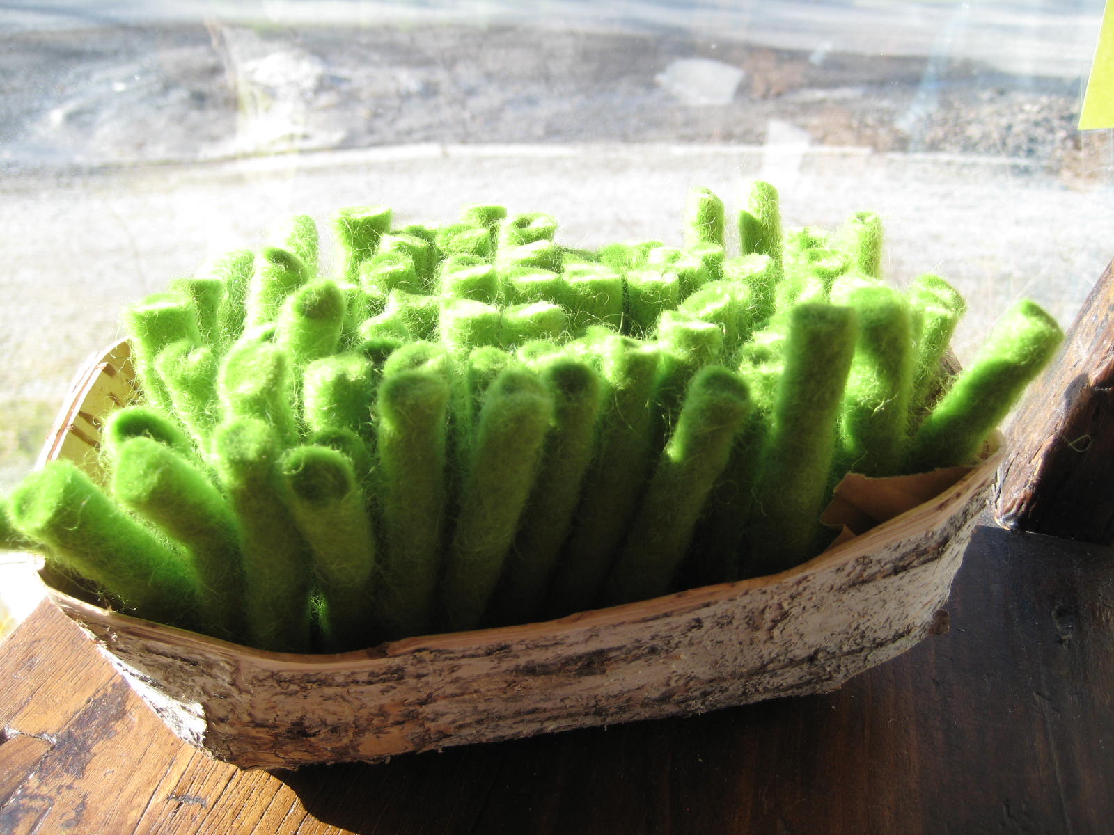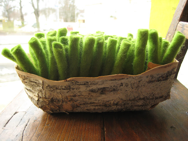 Tähän työhön meni 80 g fanttilankaa. Leikkasin pätkät n.8 cm korkuisiksi. Vuorasin tuohituokkosen paksuhkolla paperilla ja sen pohjalle laitettiin reilusti liimaa. Fanttilankapätkät istutetiin vieriviereen kokolailla tiuhaan ja siinä se. Nyt minulla on aina pääsiäiseksi valmiina rairuohoa!