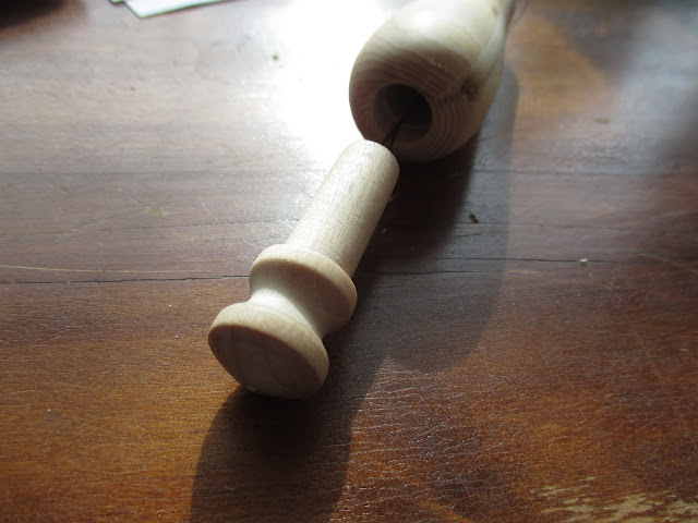 Pyysin luottopuuseppääni tekemään hengettömän, johon voi vaihtaa tuon metallilenkin. Hieno siitä tulikin, kaunis ja käytännöllinen. Astetta vielä paremmaksi tuotetta vielä hiotaan: pyysin poraamaan varteen reiän, jolloin työvälineen saa riippumaan ja näin se ehkä paremmin löytyisi tarvittaessa.