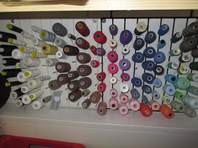 Tämän telineen voi tilata, kun kuuluu Suureen Suomalaiseen Kirjakerhoon. Kaverini tilasi minulle pyynnöstäni kaksi, itse kun en kerhoon kuulu. Tuo olisi ollut hauska kokonaisuus, mutta työhuoneeseeni pöydän läheisyyteen ei ollut mitenkään mahdollista saada telinettä kokonaisuudessaan mahtumaan, joten jouduin tinkimään kauneudesta. Koko ompelukonekoriste meni hyllyn taakse piiloon. Mutta tilaa on nyt lankarullille riittämiin, kun kaksi telinettä laitettiin vierekkäin.