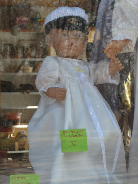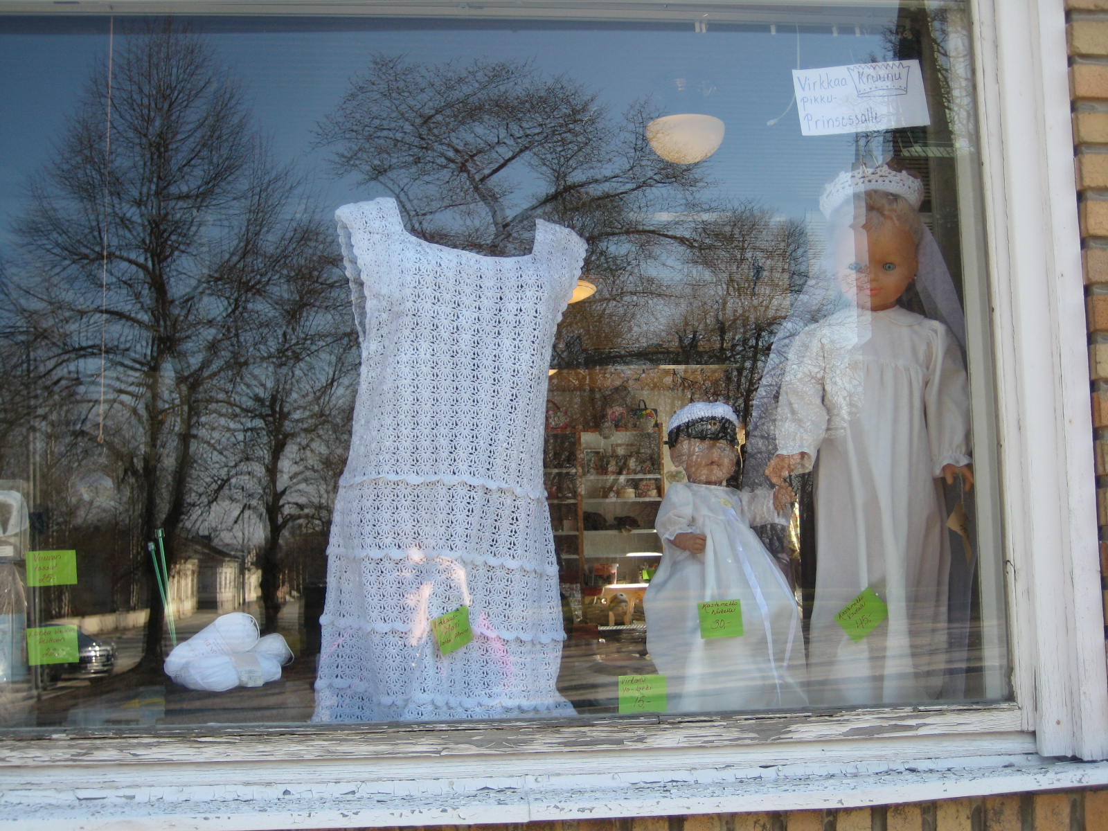 Kastemekko on ”lavastettu” prinsessan mekoksi. Häthätää prinsessalle virkattiin myös kruunu. Baby Bornilla on nuken kastemekko ja ylioppilaslakki päässään. Lisättiin vielä aikuisen kokoinen virkattu neulemekko. Kastemekon kanssa sopisivat suloiset vauvan töppöset. Ei, mutta nehän onkin pudonneet – ei niitä tässä kuvassa näykään… Toisaalta tämän kuvan ottamisen jälkeen lisäsin ikkunaan vielä musta-valkoisen keinutuolin peitteen. Lisäksi kuvassa on vähän ruskeamusta-kankaita.