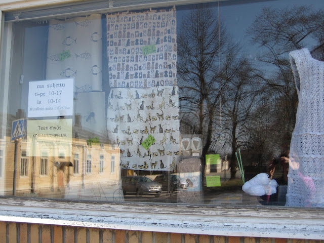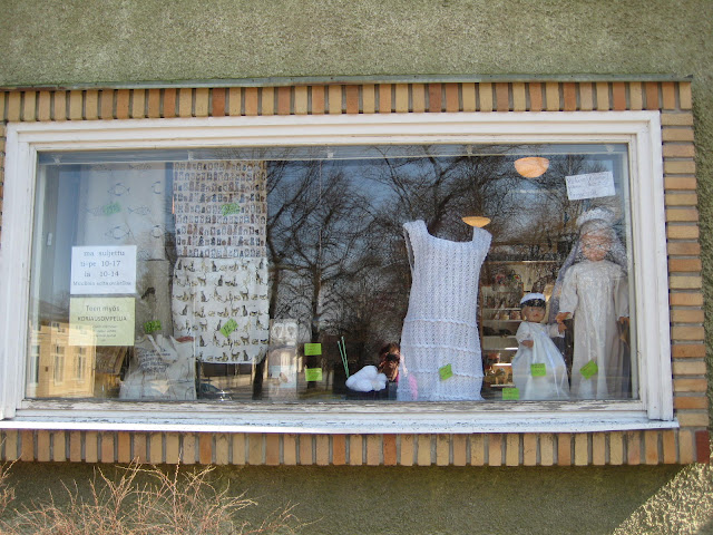 Kun somistimme uuden näyteikkunan, tokaisin, että kun kaikesta valkoisesta lumesta on juuri päästy, me laitamme ikkunan valkoiseksi. No nyt on valkoista maassa ja ikkunassa. Väriteemalla on siis somistettu tämäkin näyteikkuna.
