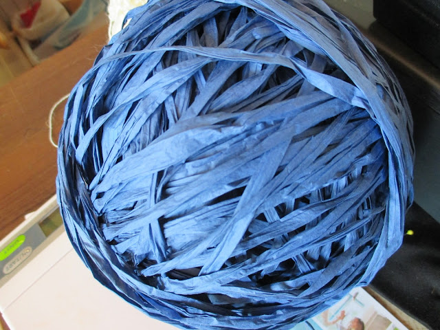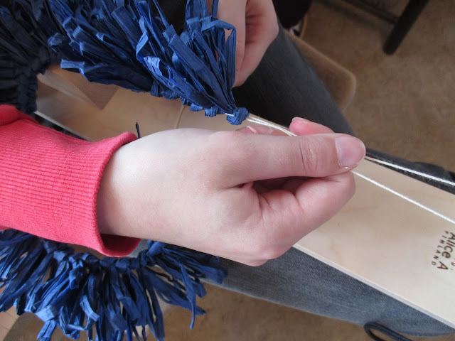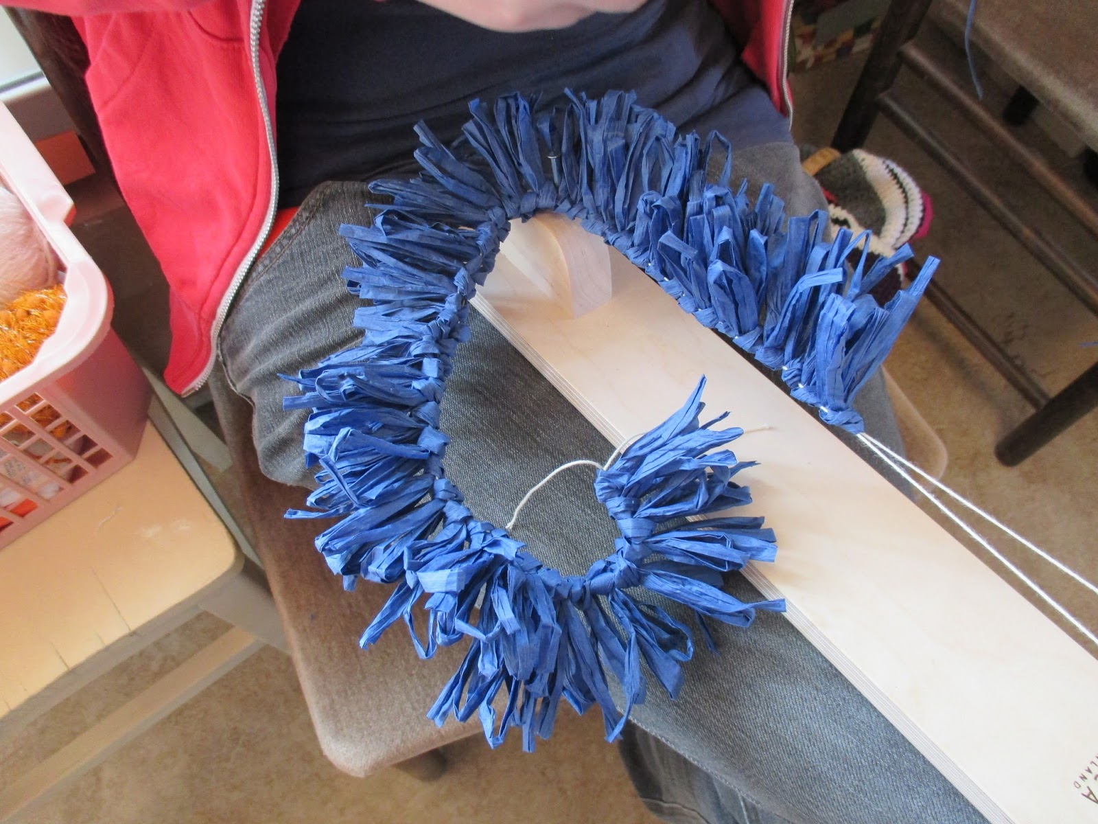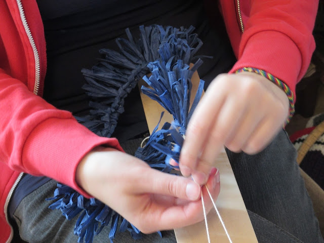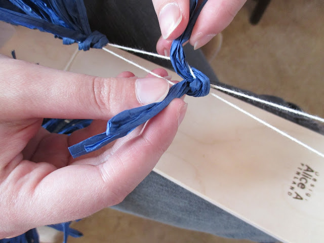 Valitsimme merellisen, sinisen paperinauhan. Työtavaksi muutamasta vaihtoehdosta Veera valitsi sen, että pätkitään nauha 50 cm pätkiin, jotka taitetaan nelinkerroin. Kalalankaiseen ”loimeen” tehdään tällä nipulla ryijysolmu.