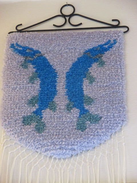 Putiikkiin saapui ryijyn kutoja näyttämään tuotteitaan. Hänellä on kuulemma kolmet kangaspuut, joista yhdessä on aina loimi vaakunaryijyjä varten. Tilauksesta hän voi tehdä minkä vaan paikkakunnan vaakunasta ryijyn. Näin ymmärsin. Luovutettujen alueiden vaakunat ovat kuulemma erityisen suosittuja.