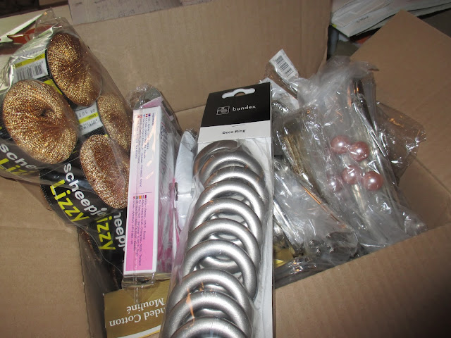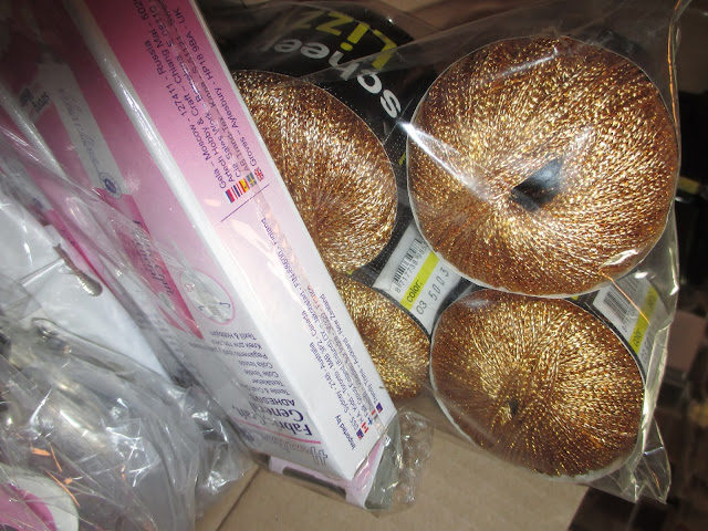 Sen lisäksi kaksi eri lähettiä toi kaksi eri pakettia. Toisessa on lankoja ja tässä toisessa kaikkea kivaa pientä tilpehööriä. On kuin joulu olisi. Kukkaronkehyksiä monenmoisia, verhorenkaita, kulta- ja hopealankaa nipsuvirkkauksiin, avaimenperärenkaita, kassinsankoja, tekstiililiimaa kukkaroitten valmistamiseen ja ja….