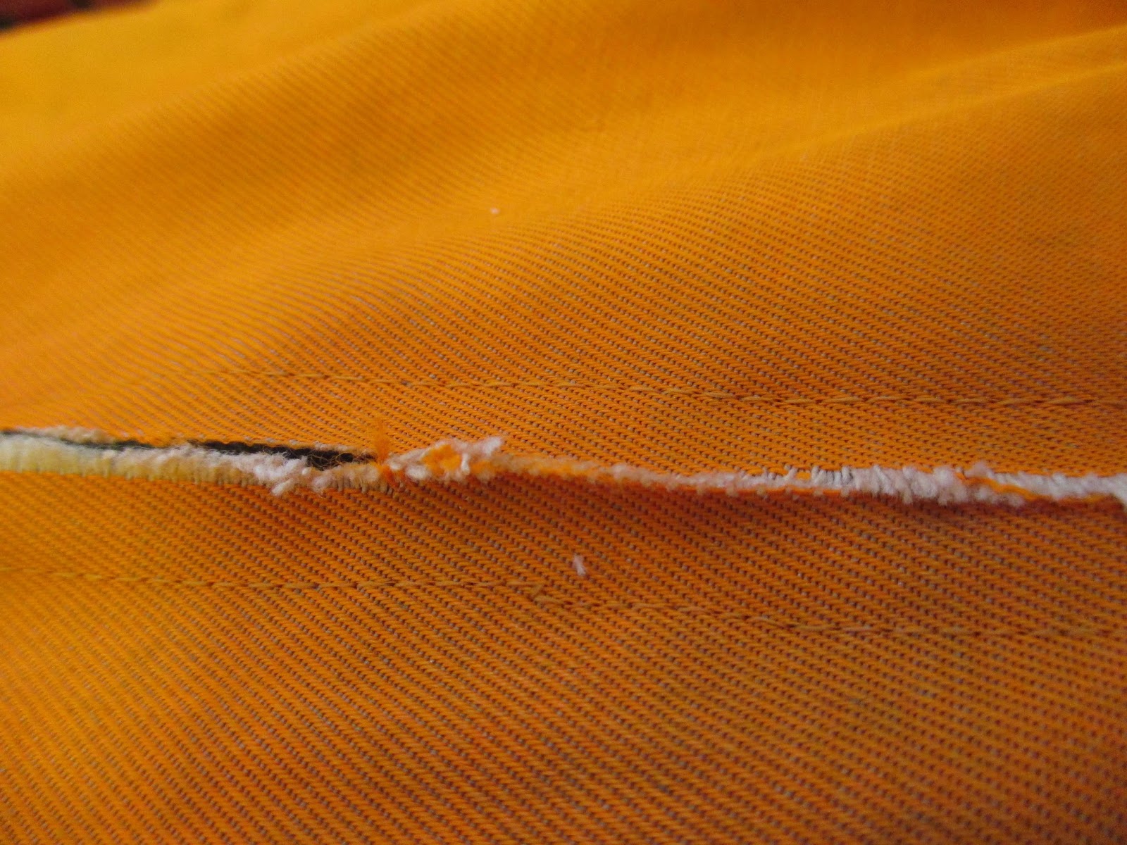 Ensimmäiseksi leikkaan sopivan paikan ja neulaan sen korjattavan kohdan alapuolelle.
