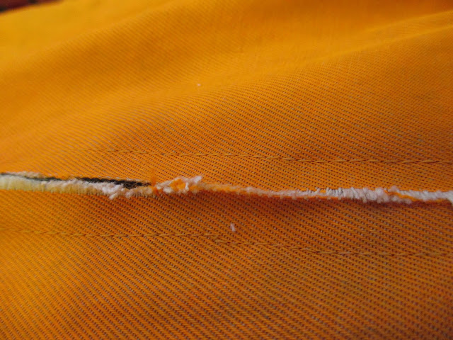 Tässä esittelemässäni tapauksessa tärkeintä on, että housun persusta kestää, ei niinkään kaunis ulkonäkö. Repeämä oli koko pepun mittainen:
