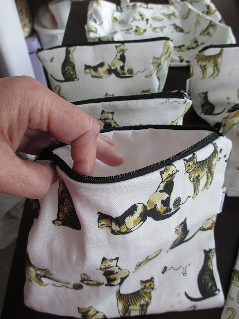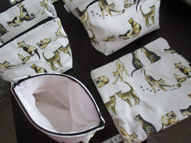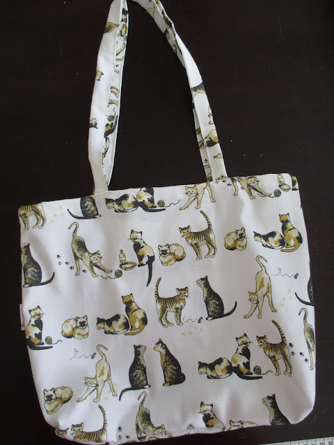 Moni asiakas on ihastellut kissakangasta, josta en ole vielä yhtään mitään tehnyt. Eilen innostuin touhuamaan niin, että vielä näppipyyhkeitten valmistuttua ”suhasin” muutamat kissapussukat ja yhden kassin.