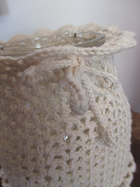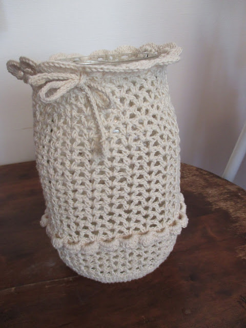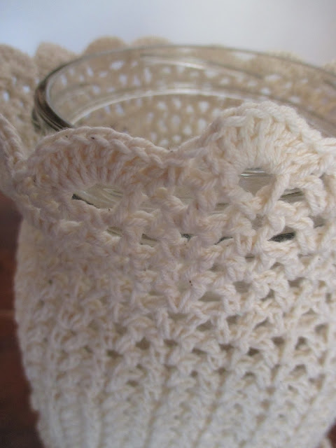 Työ aloitetaan pohjasta. Ensin virkataan pylväillä ympyrää purkin pohjan kokoiseksi. Sitten jatketaan pitsikuviota – pylväs, 2 ketjusilmukkaa, pylväs – ja sama seuraavaan kahden ketjusilmukan kaareen. Tätä tehdään niin kauan, kunnes purkki peittyy. Yläreunaan voi kehitellä jonkun kivan reunuksen. Samoin pitkin matkaa voi virkata jotain kuvioita, raitoja tai reunuksia omien taitojen ja fiiliksen mukaan. Mutta ei ole välttämätöntä. Tuosta peruspitsistäkin tulee tosi kaunis heijastuma, kun sisälle laittaa ”jouluvalonauhan”.