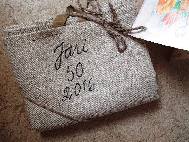 Siinä ei kauan nokka tuhissut, kun ompelin 2 m x 80 cm pellavapyyhkeen. Tein siitä persoonallisemman tekstillä. Olisin halunnut kirjoa, mutta siihen en uskonut ajan riittävän – tekstiilitussi sai siis kelvata. En usko, että teksti kovin kauaa pysyy, vaikka sitä kovasti kuumalla silittelinkin. Mutta niinhän ne muistot muutenkin haalistuu…