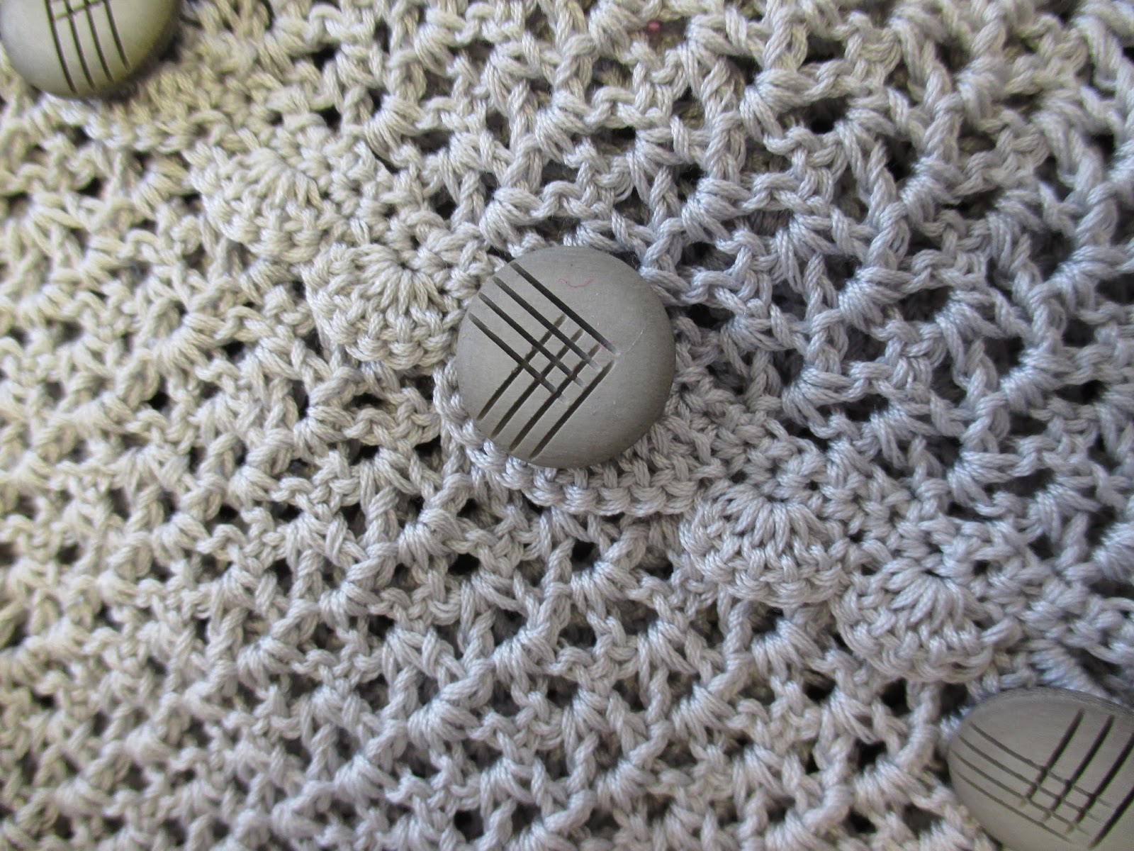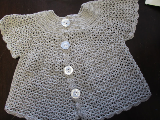 Nuttu, tai oikeastaan bolero. Tarkoitukseni oli tehdä nuttu, mutta suunnitelmat muuttuivat työn edetessä. Ohje ei ollutkaan valitsemalleni langalle sopiva, piti säveltää. Hihoista ei tullutkaan nätit, piti purkaa. Lopulta tein matkalla mukaellen. Ohjetta tähän ei siis ole, mutta kuvasta voi aika hyvin päätellä. Työ aloitetaan kaula-aukosta ja tavoitteena lisätä silmukoita niin, että työ pysyy koko ajan ympyränä.. Hihojen jälkeen lakkasin lisäämästä. Lopuksi ommellaan sivusaumat kainalosta alaspäin ja virkataan reunoihin simpukkakuviota.