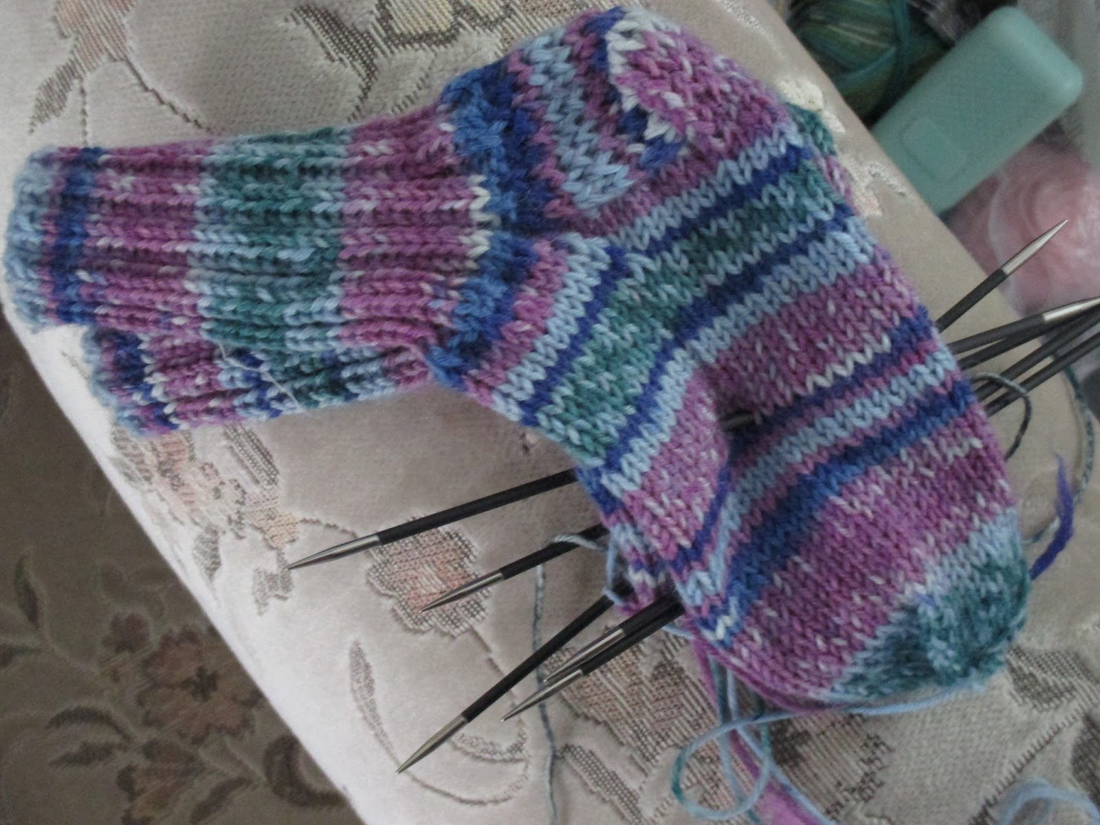 Rrrrrrakastan sukkien kutomista. Ja nyt minulla on kertakaikkiaan ihanteelliset olosuhteet siihen. Innostuksen ilmaantuessa – tai edellisten valmistuttua – käyn vaan nappaamassa putiikin puolelta mieluisen langan. Jos sukkapuikot on hukassa, voin käydä avaamassa uuden sukkapuikkopaketin.