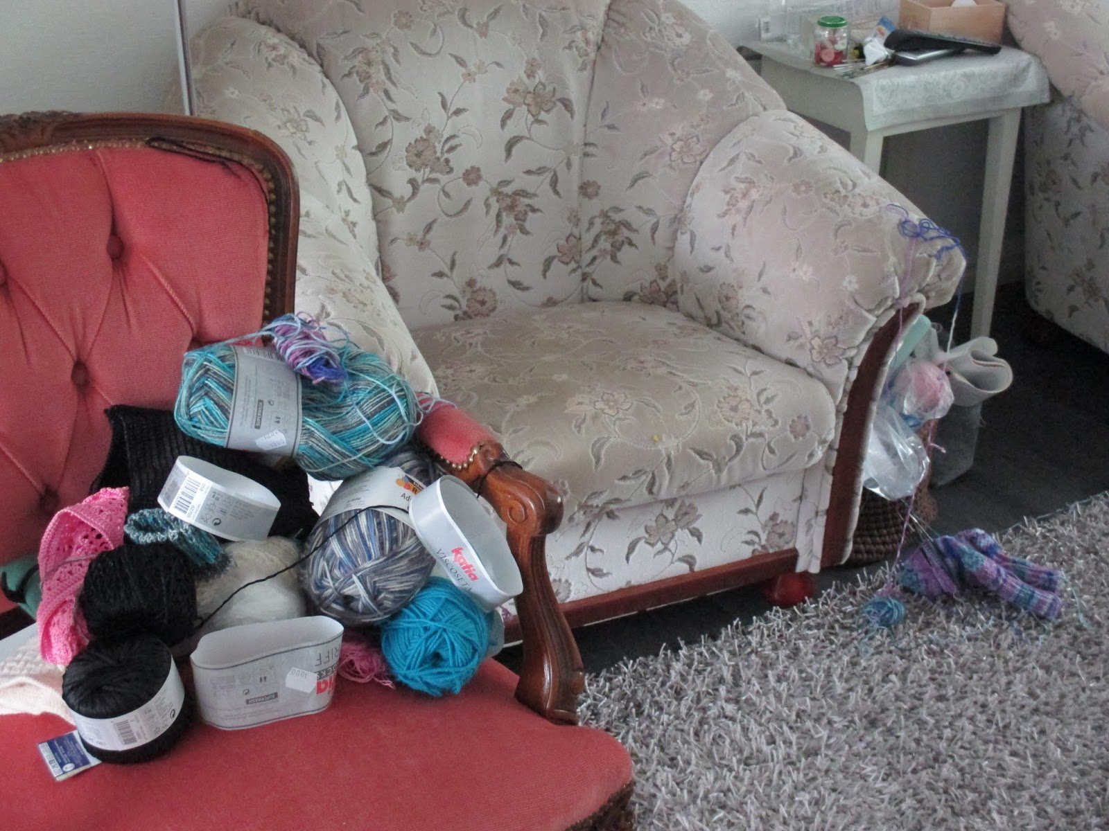 Tällainen kaaos vallitsee meidän olohuoneessa. Tässä nojatuolilla istuen luovuus lähtee laukkaamaan, eikä tavarat pysy järjestyksessä, ei sitten niin millään.