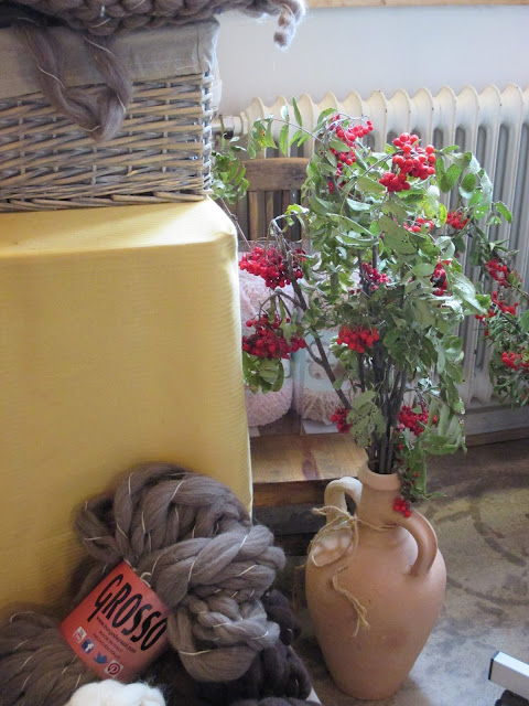 Saimme eilen kolme valtavaa pahvilaatikollista syksytuotteita. Eteiseen somistimme tällaisen nurkkauksen.