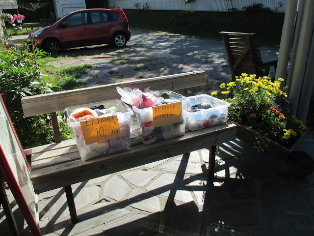 Laitoin kaikki omat lankani kirppismyyntiin. Onhan sekin hassua, etten itse halua käyttää, mutta kuvittelen, että joku muu haluaa. Niin se vaan menee… Nyt meillä on putiikin edusta ollut jo monta viikkoa täynnä lankoja. Työlästä kyllä, joka aamu lankalaatikot nostetaan esille ja illalla pinotaan sisälle. Onneksi on avustajat!