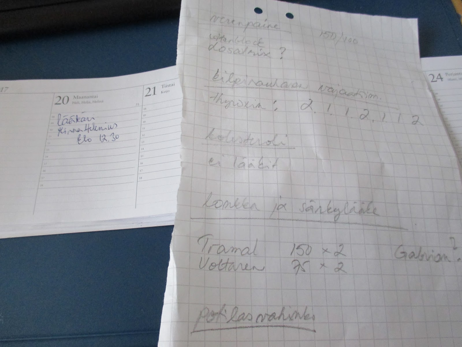Kävin tänään lääkärissä. Olin tilannut ajan toista kuukautta sitten, enkä heti meinannut muistaakaan, mitä mun oikeastaan piti valittaa. Kirjoitin asiat lapulle (toisen lääkärille ja toisen itselleni) ja sitten huomasin, ettei yksi puolen tunnin aika edes riitä kaikille ongelmille. Suosittelen muuten toisillekin – kannattaa ottaa mukaan muistiinpanot, kun menee lääkärille. Hermostuksissaan helposti unohtaa asioita.