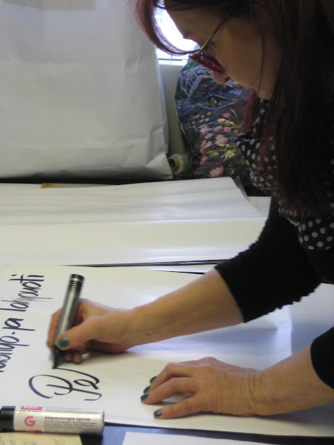 Olen aina hävennyt itse väsäämiäni ständejä. Vaikka minulla on hyvä käsiala, kun kirjoitan tavallista tekstiä (ja jos keskityn) mutta sitten kun pitää ottaa käteen valtavan iso tussi ja yrittää tehdä 10 cm korkeita kirjaimia, niin lopputulos näyttää ihan kahjolta. Näitä ei tarvitse hävetä.