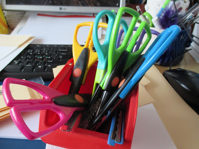 Ensin etsin pahvin. Totesin sen liian pliisuksi ja innostuin vähän ”koristelemaan” sitä. En jaksanut sentään lähteä leikkuria hakemaan, mutta muistin, että minullahan on kuviosakset. Aika pölyiset olivat, kun ei ole vuosiin käytetty.