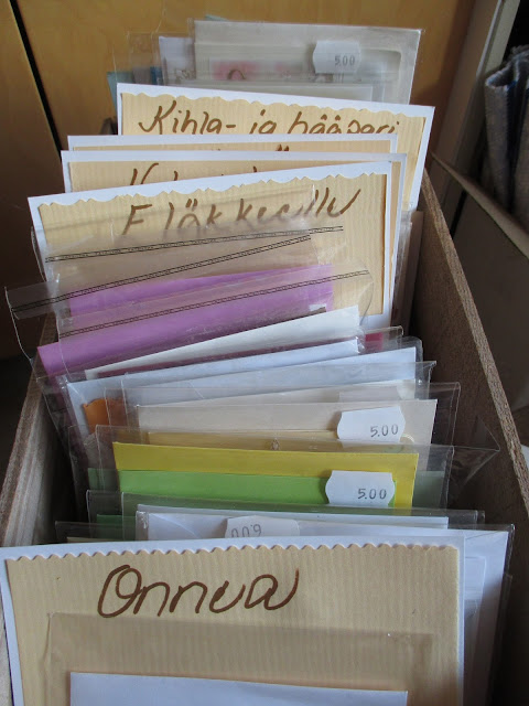 Sain heti huomata tuloksen. Välittömästi myin kortin, joka oli näin laitettu ESILLE. Loput kortit jätin laatikkoon, mutta päätin tehdä niille välilehdet, jotta eri aihepiirit erottuisivat.