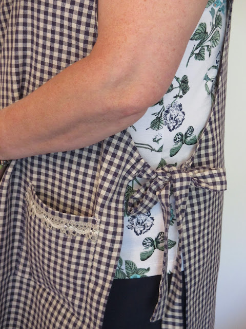 Yläkuvassa toiset nauhat on jätetty roikkumaan sivulle, ne voisi toki solmia eteen, joko essun alla tai päällä. Alakuvassa nauhat on solmittu sivuille.