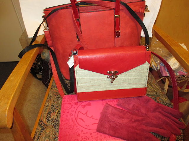 Nämä kuvat on otettu puoli vuotta sitten, Tampereen kädentaitomessujen jälkeen. Sieltä ostin tuon toisen punaisen olkalaukun. Olen aiemminkin nähnyt kirjoista tehtyjä laukkuja, mutta tämä on mielestäni tilavampi, kuin yleensä ovat. Uusi tietosanakirja on muuttunut laukuksi ja saanut pieleensä tosi kauniin salvan.