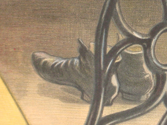 Yhden oven päälle tuli tällainen kollaasi. Vanhaan, tosi kuluneeseen puulaatikkoon tein asetelman, jossa on isoäitini fammun tai fasterin kirjailema – niin, mikähän tuo kangaspala on? – ja pienet sakset, isoäidin prillit, vanhoja kirjainten kirjailumalleja, kangasnappeja ja lankarullia.
