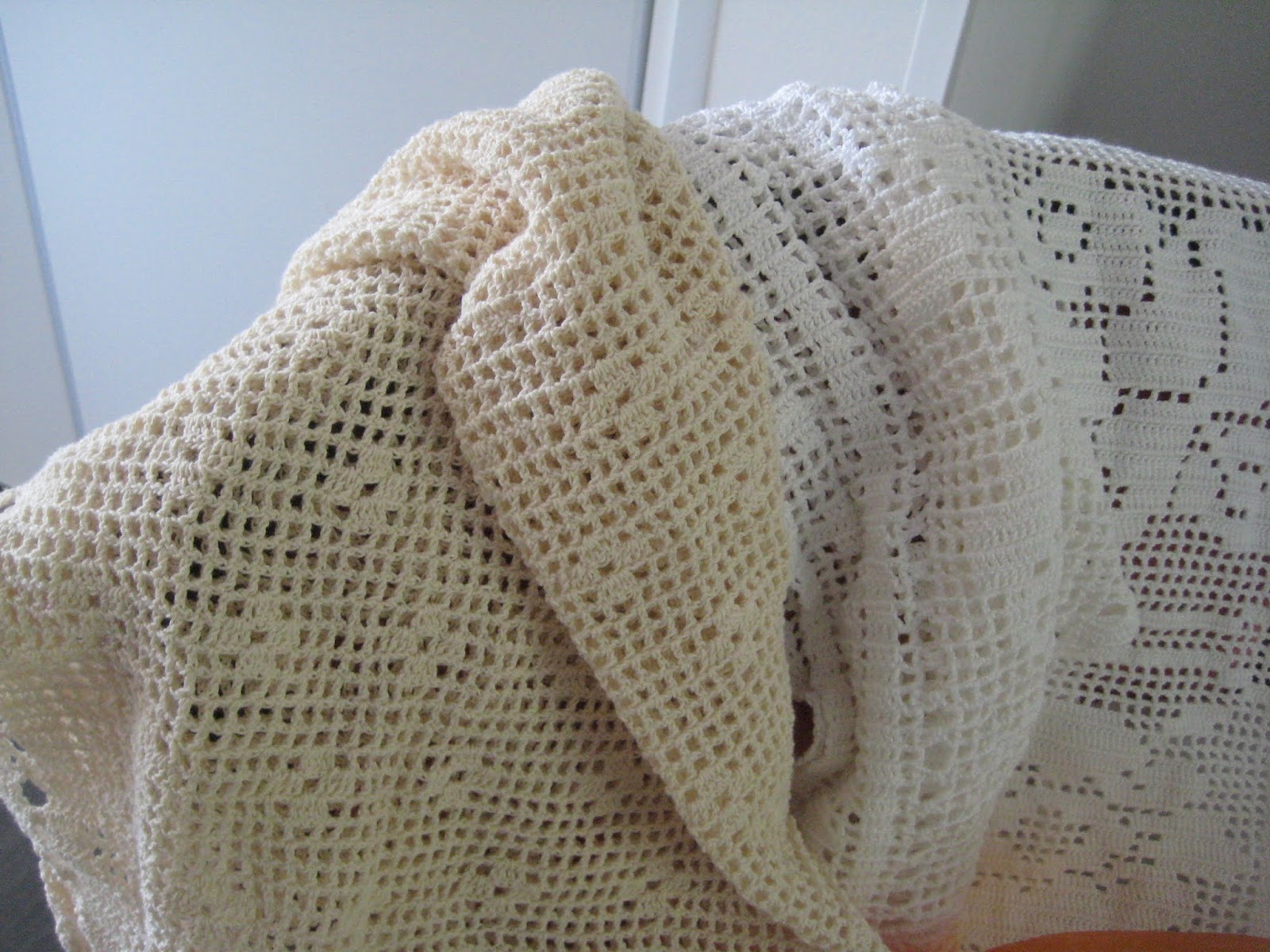 Pöytäliinoja, -tabletteja, verhoja ja muuten vaan virkkauksia. En todellakaan nyt aloittaisi tuollaisia töitä. Ei niitä kaupasta kukaan osta, eikä oma sisustustyylini ole enää tuollainen romanttinen.