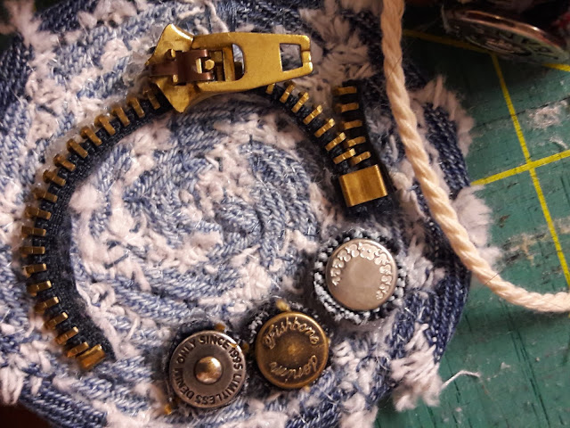 Aivan uskomaton paikka oli kellarissa, missä oli hänen työhuoneensa. Pikkuruinen matala tila TÄYNNÄ tarvikkeita. Kaikki hienossa värijärjestyksessä. Pieniä kopperoita oli täynnä farkkuja ja muuta kierrätysmateriaalia. Itse en ikinä pystyisi pitämään niin hienoa järjestystä yllä.