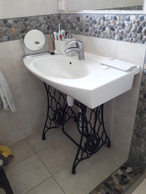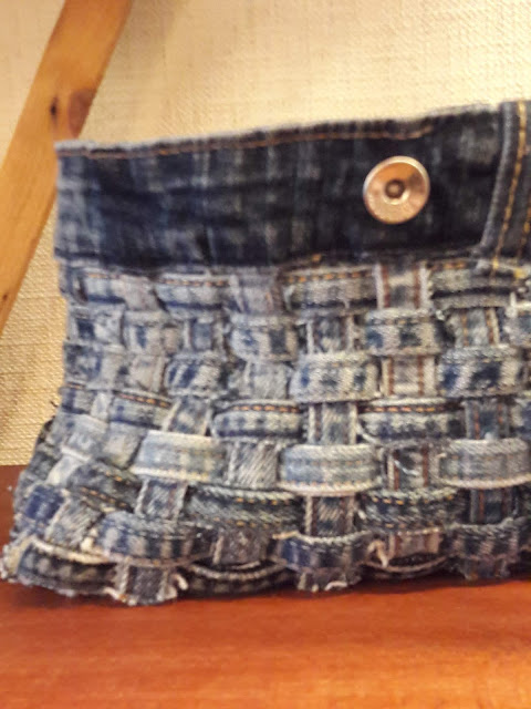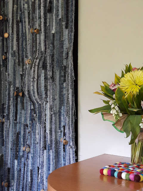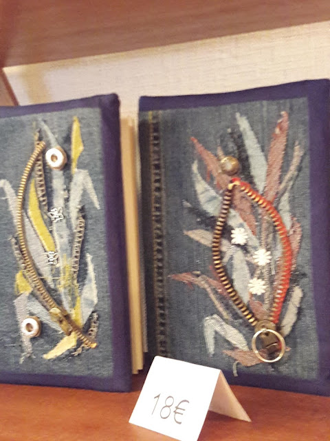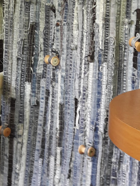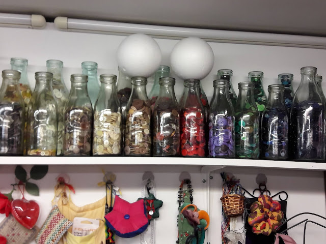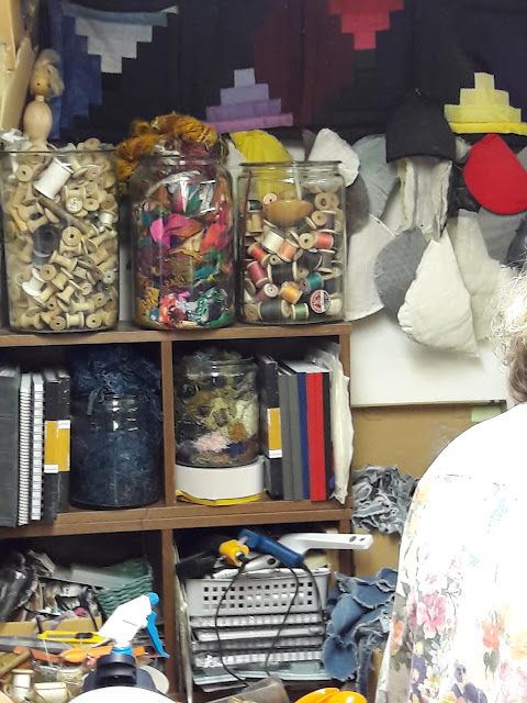Aivan uskomaton paikka oli kellarissa, missä oli hänen työhuoneensa. Pikkuruinen matala tila TÄYNNÄ tarvikkeita. Kaikki hienossa värijärjestyksessä. Pieniä kopperoita oli täynnä farkkuja ja muuta kierrätysmateriaalia. Itse en ikinä pystyisi pitämään niin hienoa järjestystä yllä.