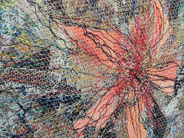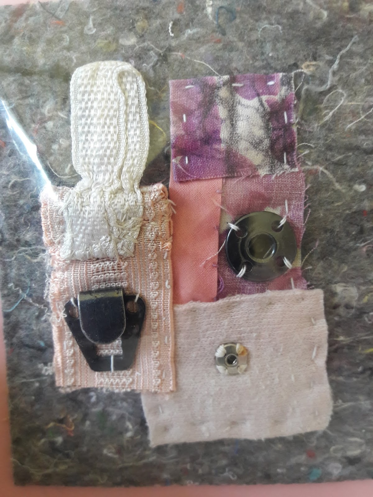 Taitelija käyttää kaiken materiaalin hyväkseen. Lopuista langanpätkistä, tilkuista, paikoista, napeista, nauhoista ja pitseistä hän valmistaa kortteja.