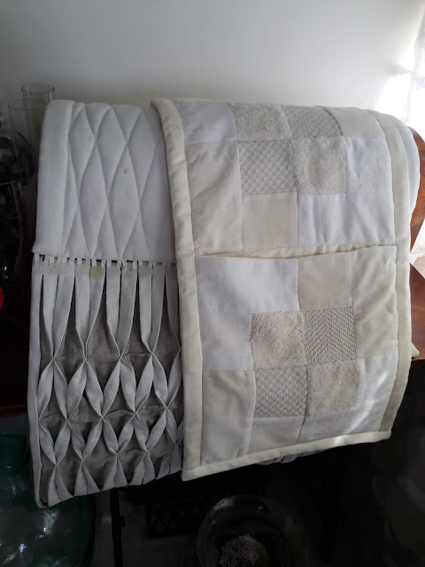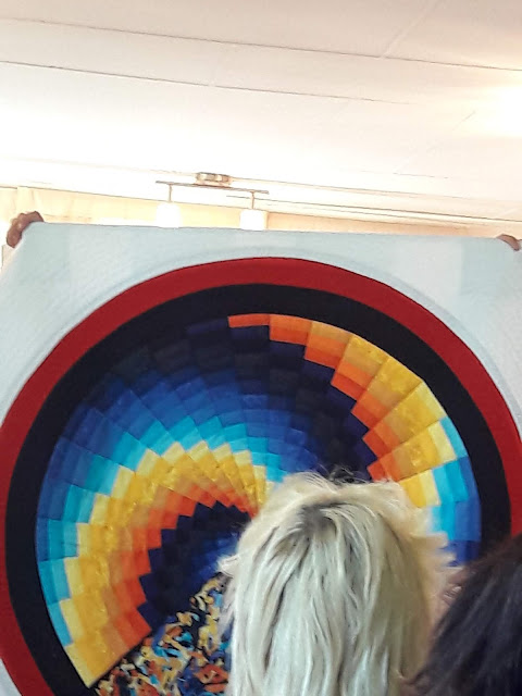 Näimme monia eri puolilla maailmaa palkittuja töitä. Yksi huone oli täynnä myytäviä tilkkupeittoja, jotka Marja on kaikki tehnyt alusta loppuun itse. Myytävää oli joka puolella.