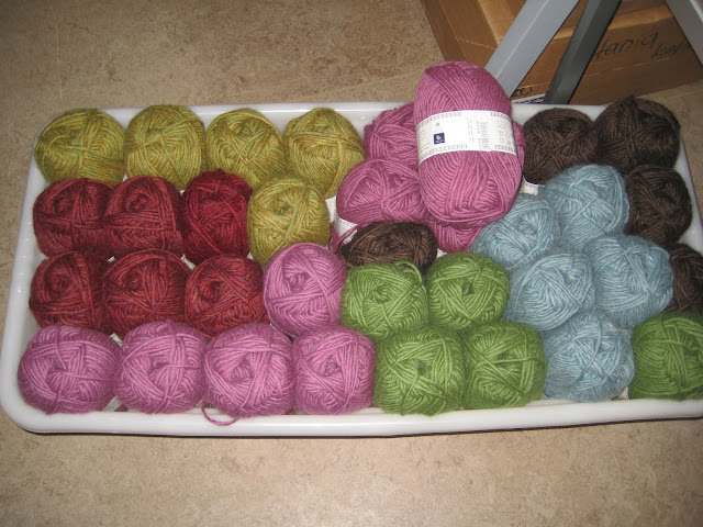 Osa lankojen väreistä on myös loppu tukusta, esimerkiksi keltaista ei saa tällä hetkellä. Minä olen tehnyt valintoja niin, että arvelen, millaisista väreistä tehdään pääosa puserosta ja otan niitä värejä enemmän. Sen sijaan mielestäni raita- ja pilkkulankoja olen ottanut vähemmän. Näin saan laajemman valikoiman.