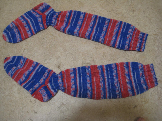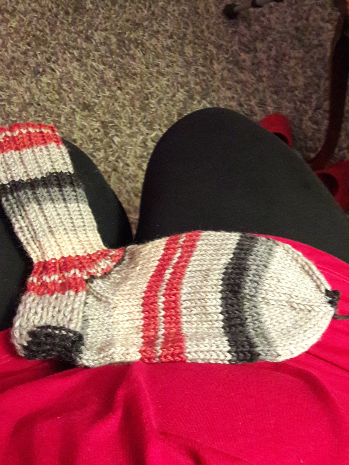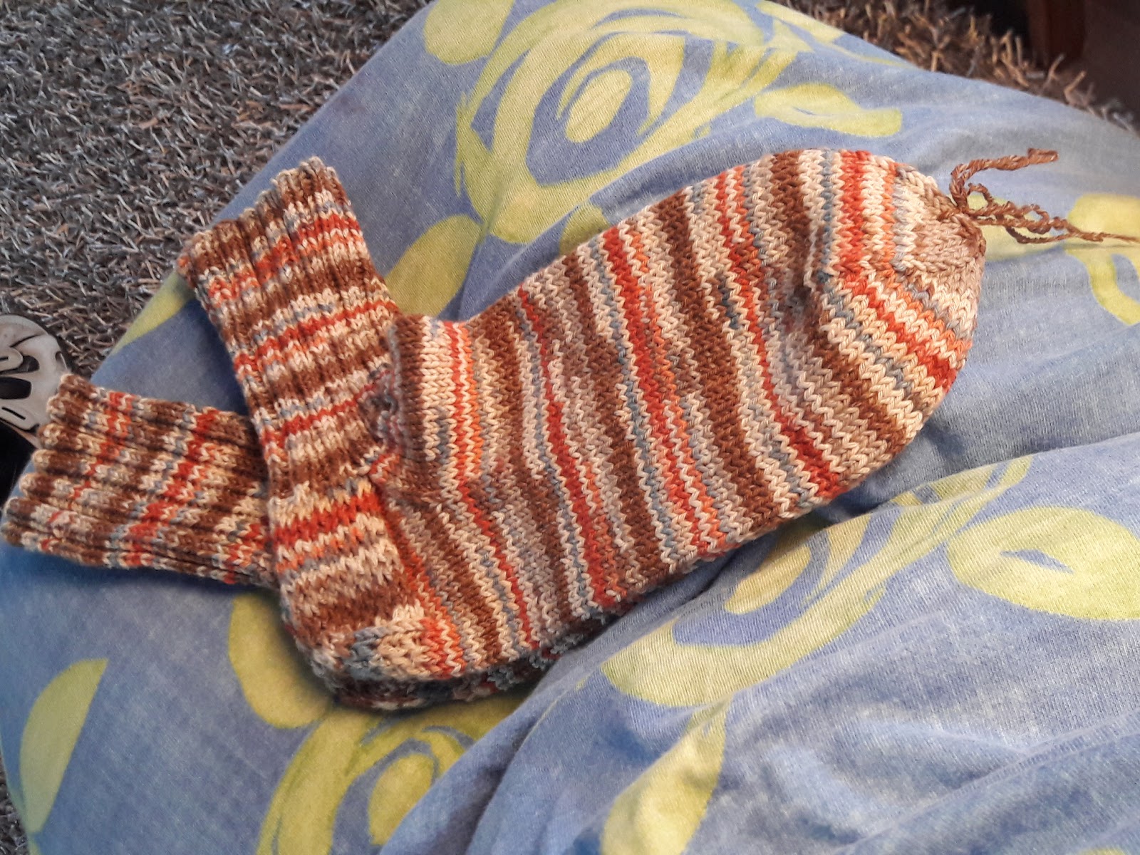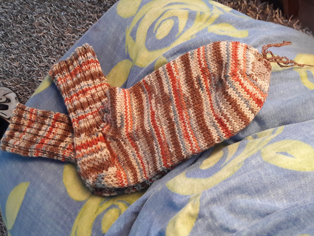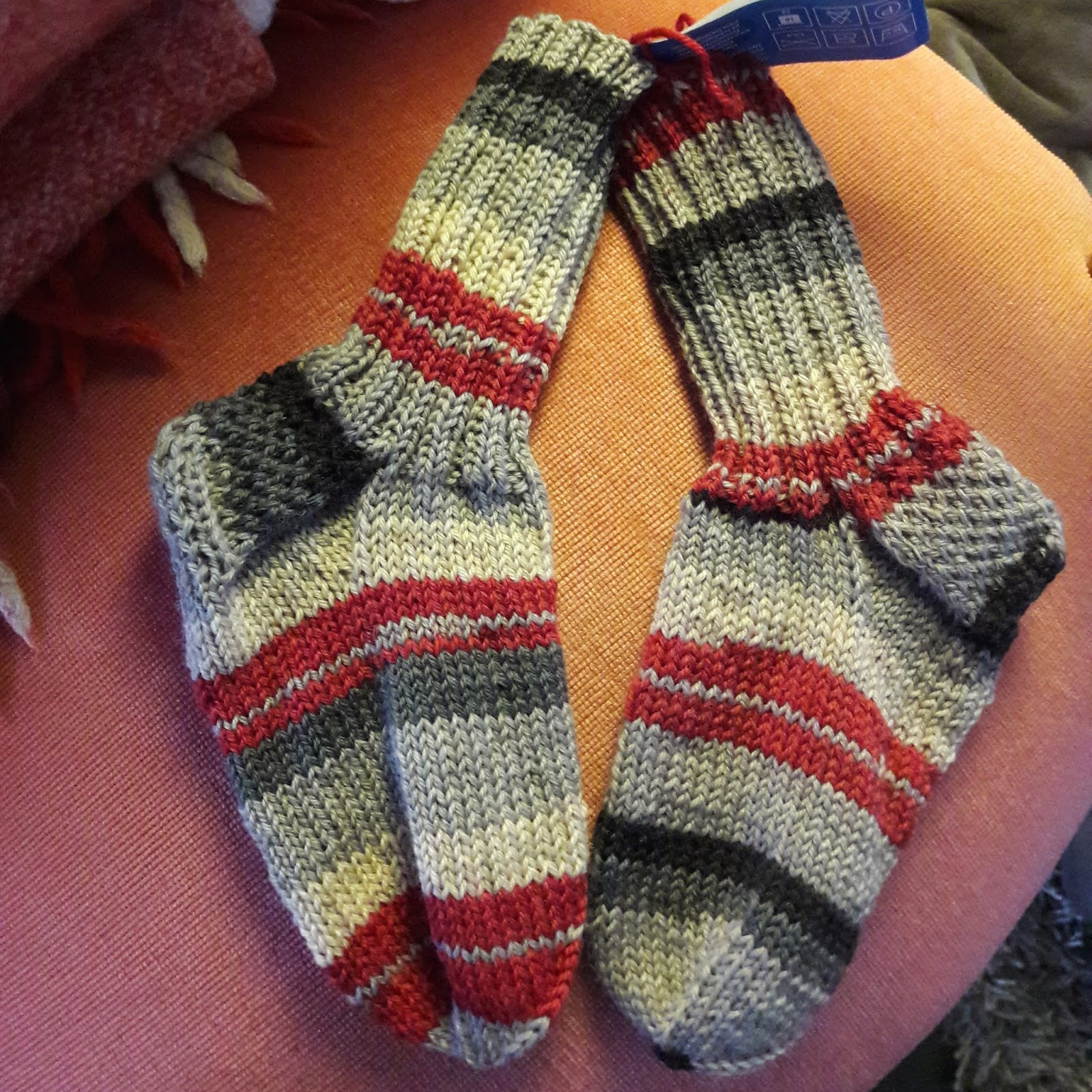 Sitten esittelen muutaman sukan, jotka on neulottu Tekstiiliteollisuuden perussukkalangoista. Tässä paksumpi Salla, joka on seiskaveikan paksuinen (meillä ei ole ollenkaan Novitan lankoja myynnissä). Nyt on puikkoina KnitPron Cubicsit eli nelikulmaiset sukkapuikot ja näköjään lyhyt eli sormikaspuikot.