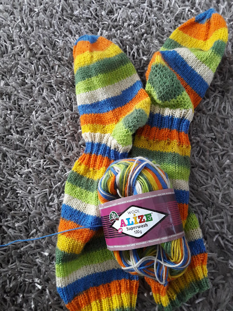 Pyrkimykseni on tehdä myynnissä olevista langoista mallineule. Tässä Alize Superwash, ihana sukkalanka. Tasaraidat tulevat automaattisesti.  Yhdestä kerästä tulee piiiitkät sukat.