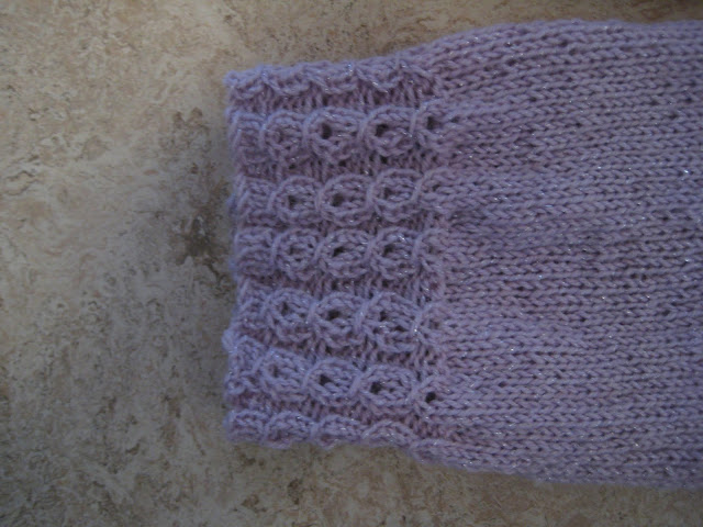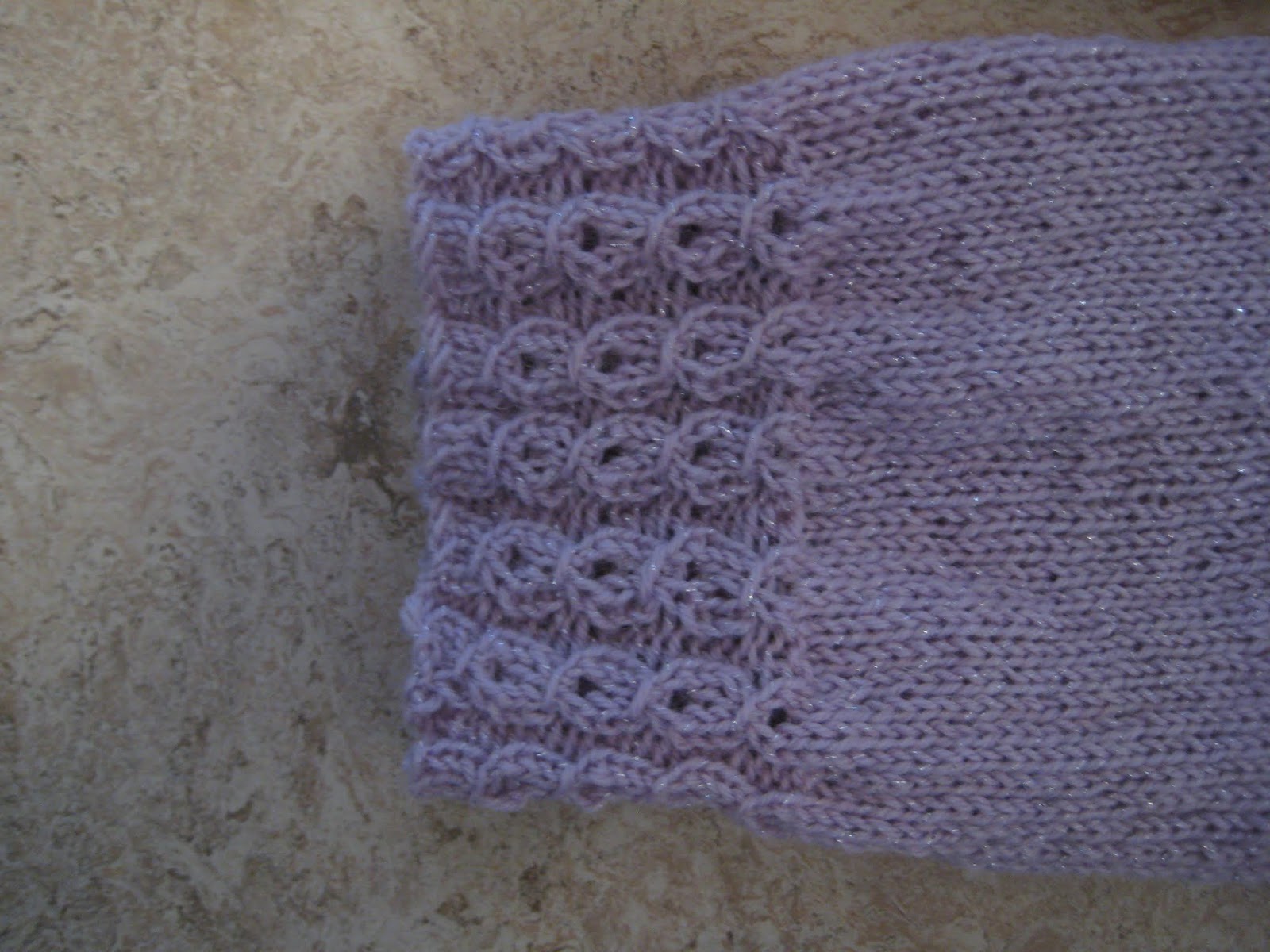 Laiskuuttani en viitsinyt alkaa pitsikuviomallia etsimään ja silmukoita laskemaan, vaan tein ainoastaan alku- ja loppupäähän valepalmikkoa resoriksi ja välin pelkkää sileää. Valokuvausvaiheessa totesin, että taitavat olla vähän tylsät. Laittaisinko kukkakoristeet?