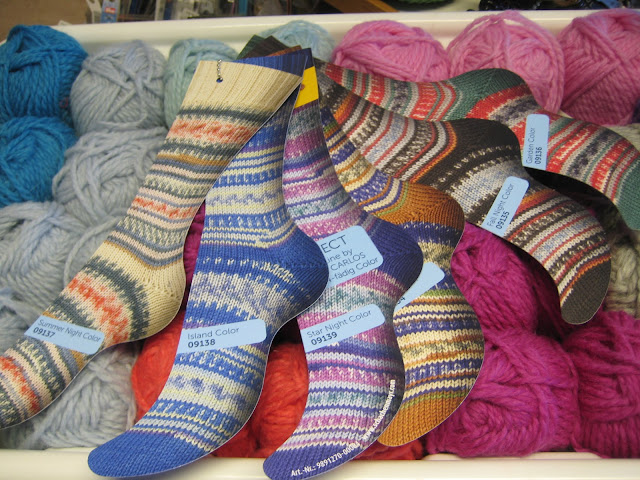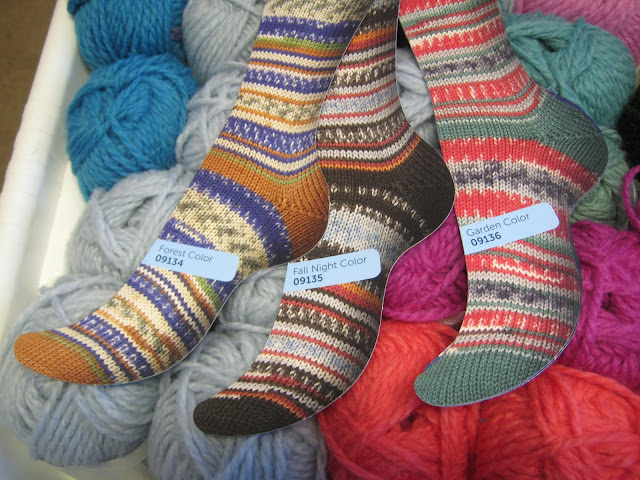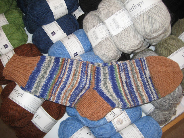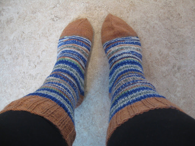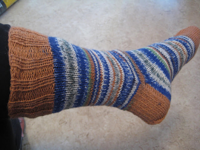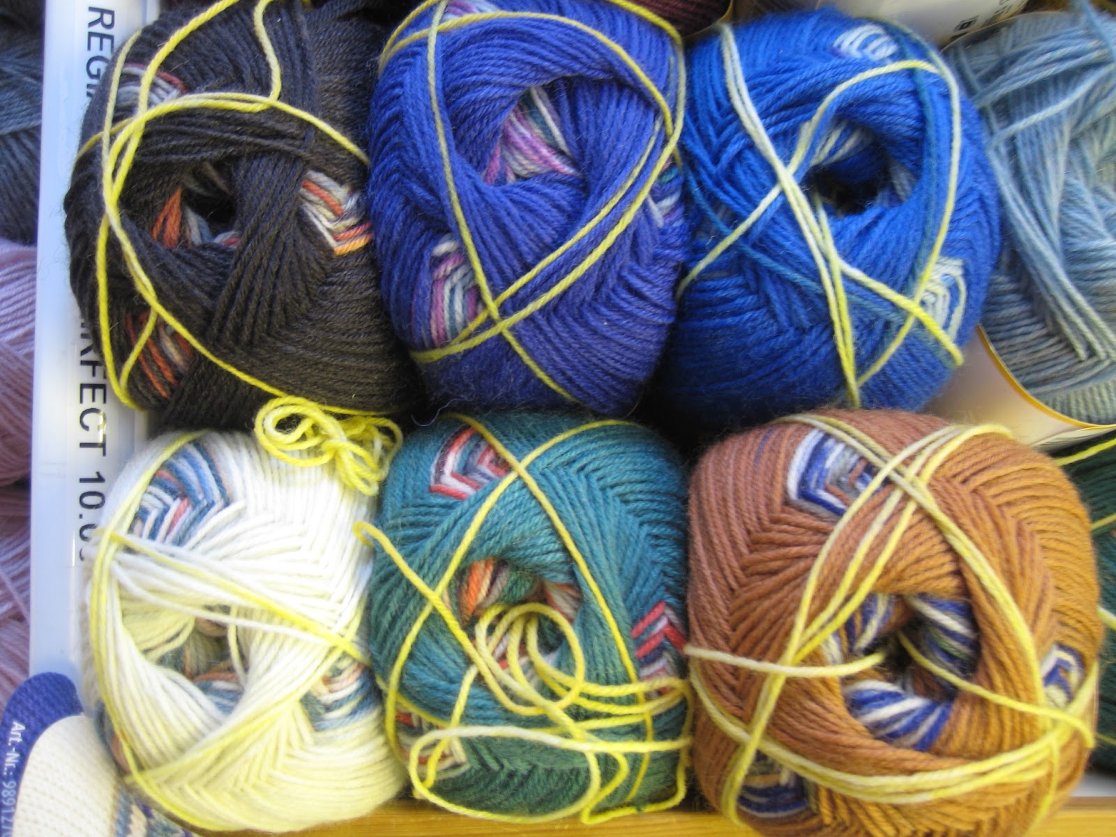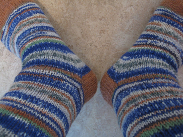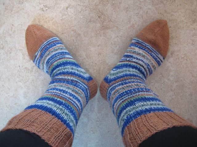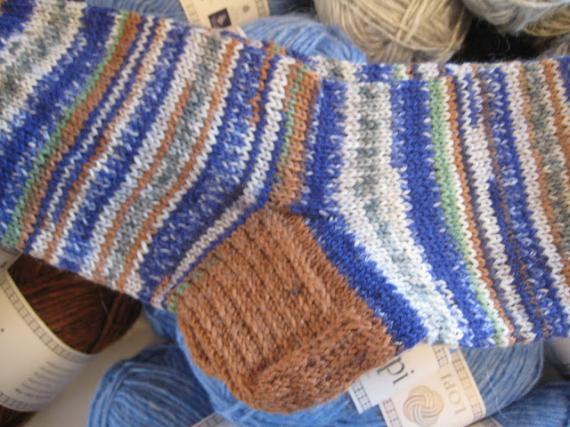 Sukan vartta neulotaan niin kauan, kunnes tulee kantapään yksivärinen osuus. Taas jatketaan kuviota, kunnes päästään varpaitten yksiväriseen. Näihin 43 koon sukkiine kului lankaa 76 gr, joten taas jäi nyttyrä käytettäväksi raitalankana. Jos kutoisi koko kerän, saisi toooosi isot miesten sukat.