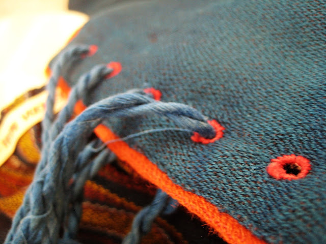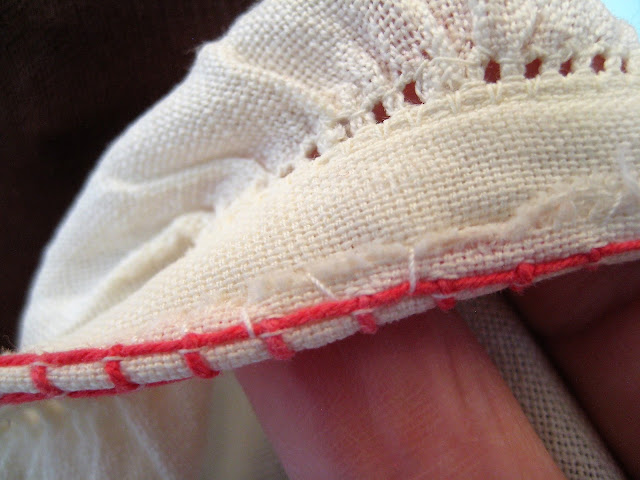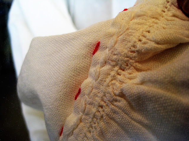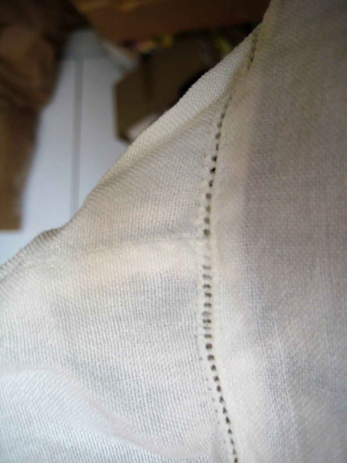 Minua vähän ihmetyttää kaulan ja hihojen reunat. Onkohan tässä käynyt niin, että reuna on kulunut ja se on taitettu sisälle, vai onko ompelemisessa tapahtunut alunperin virhe? Tässä minun puserossani punainen koristekuvio on eri suuntaan kuin muissa netistä löytämissäni kuvissa.