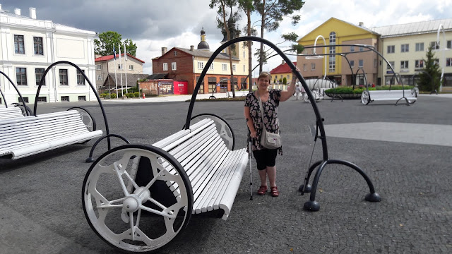 Kaupungin keskusta-alueella on erikoisia rakennelmia. Kadun varsilla oli tuollaiset valkoiset ”häkkyrät”, joiden tarkoitus ei meille avautunut. Ehkä olivat katuvaloja, vaikkei näin kesäpäivänä valoja näkynyt?