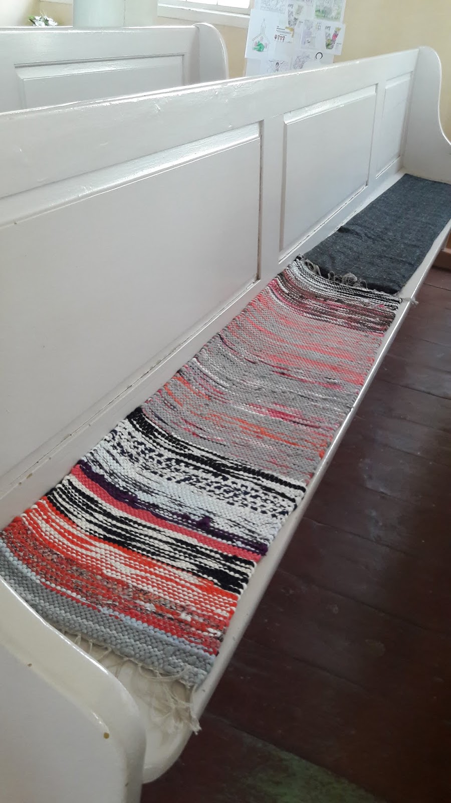 Mutta ehkä ihmisten on mukavampi istua kirkonpenkissä, kun ne on peitelty räsymatoin. Kuva Estonia-muistomerkin vieressä olevasta kirkosta. Hauska idea tämäkin!