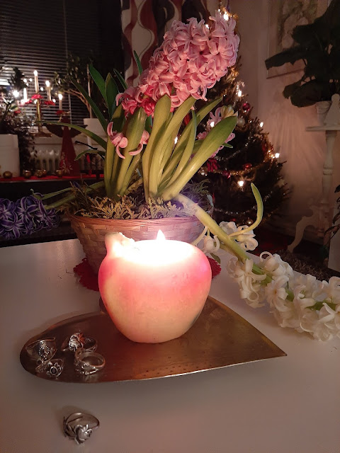 Minulla on kynttilöihin ristiriitainen suhde. Tykkään kynttilöistä ja vaihdan niitä muuhun sisustukseen sopiviksi, mutta en oikein uskalla polttaa. Pelkään tulta ja kynttilöiden pitää olla tosi turvallisesti, että uskallan rentoutua niiden äärellä. Tuohon omppukynttilään raaskin vihdoinkin laittaa tulen – onhan se jo yli 20 vuotta sitten saatu silloisilta naapureilta joulumuistamiseksi!